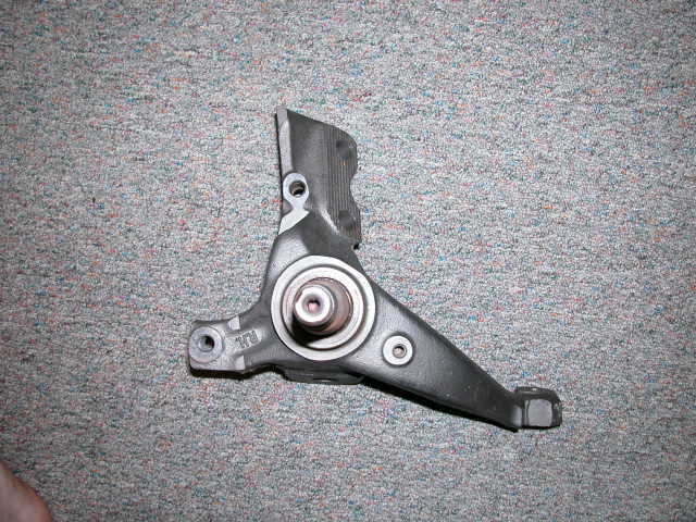 If you have seen a normal run-of-the-mill f-body spindle, this one is quite different. BAER basicly take the stock spindle, lop the "ears" off, drill and tap 2 holes, and mill the caliper mounting surface. They are pretty much EXACTLY the same as 1LE spindles!! The only reservation I have in telling you that they are exaclty the same the the distance from the top of the spindle down to the caliper cage mounting bracket. I know that the hub on the Track system is .400" further out. Even if this is an issue, it is nothing that a washer won't be able to fix... with no ill effects. |